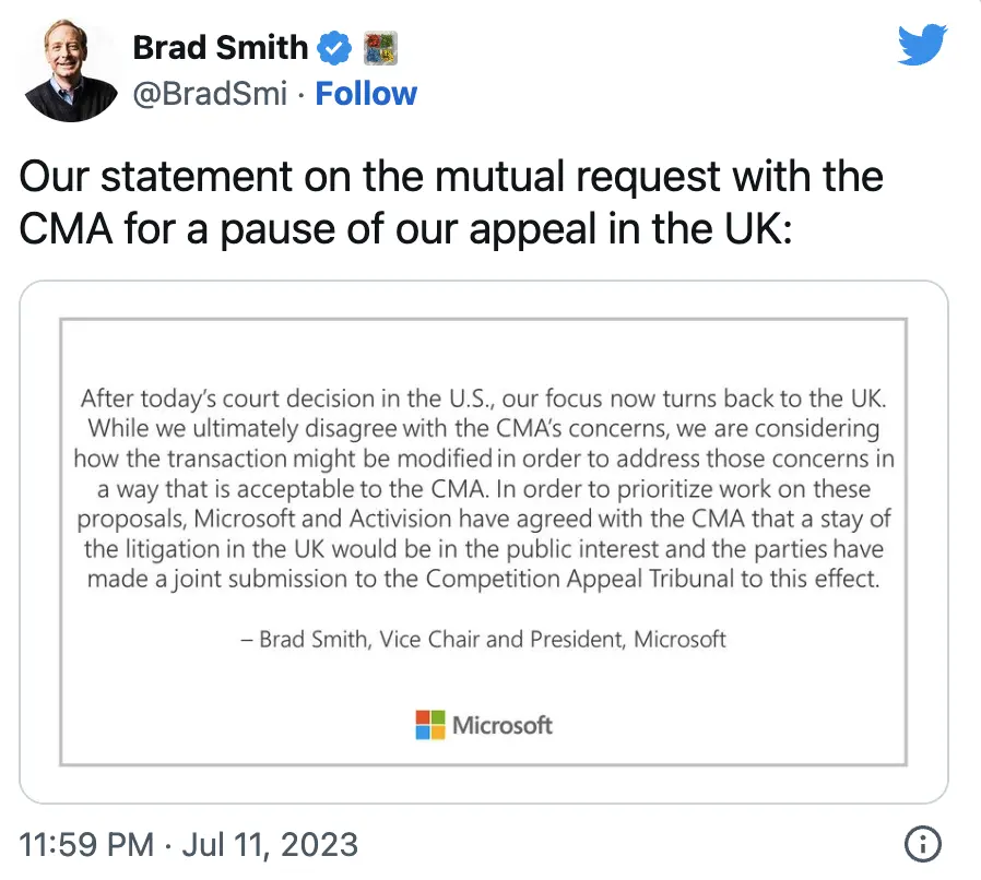 “在今天美国法院做出判决后,我们的焦点现在转回英国。虽然我们从根本上不认同CMA的担忧,但我们正在考虑如何修改交易,以便以CMA可接受的方式解决这些担忧。为了优先处理这些提议,微软和动视暴雪已与CMA达成一致,认为暂停在英国的诉讼将符合公众利益,双方已就此向竞争上诉法庭提交了联合意见书。”史密斯表示。