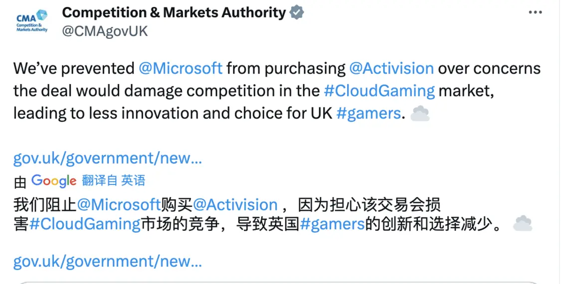 此前,英国一直“紧跟”美国,反对微软收购动视暴雪。今年4月,英国反垄断监管机构竞争和市场管理局(CMA)表示,已阻止微软收购动视暴雪的交易,原因是担心此交易会损害云游戏市场的竞争,削弱创新,导致未来游戏玩家的选择变少。