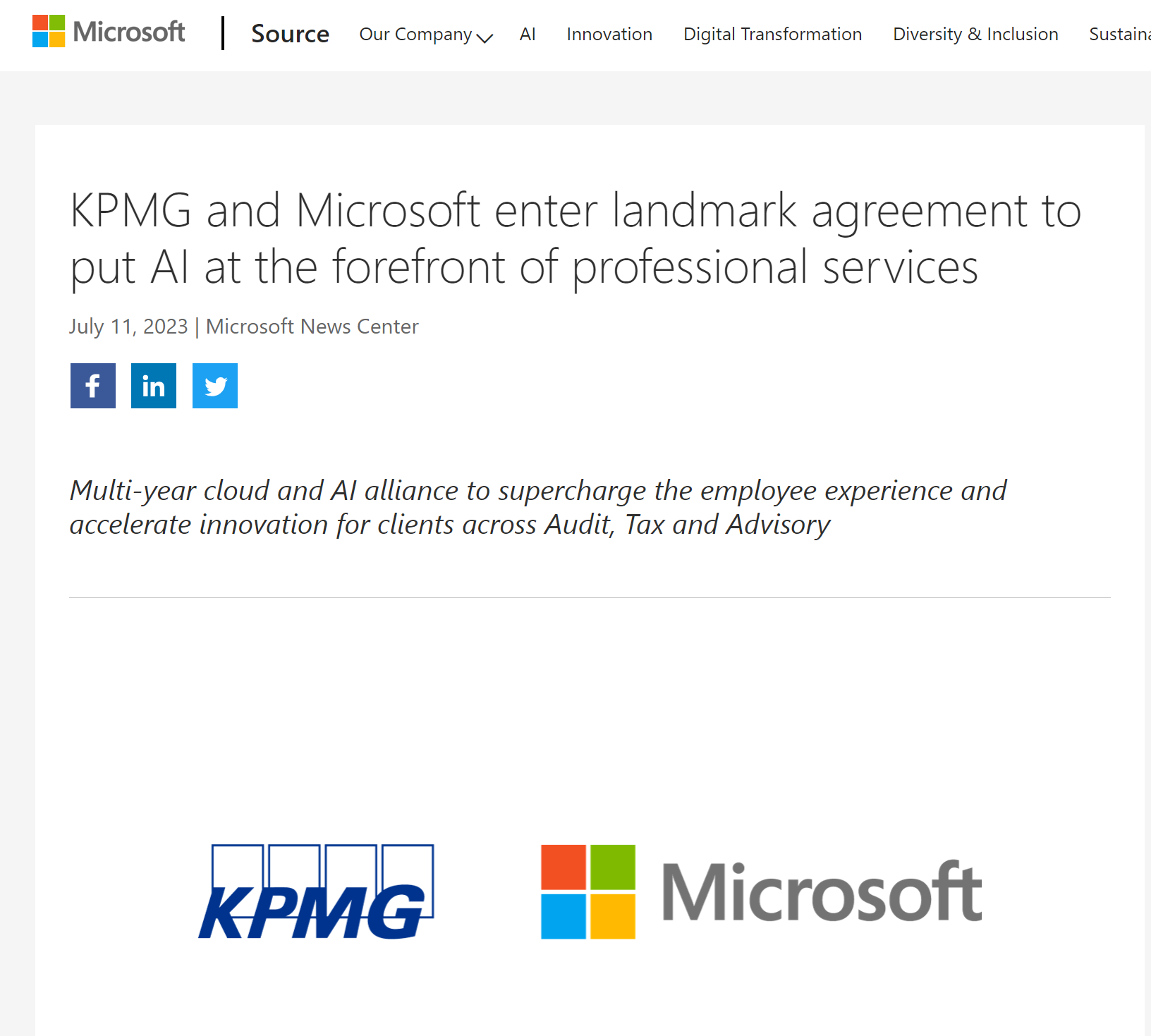 据报道,全球四大会计事务所之一的毕马威(KPMG)与微软达成了里程碑式的协议。前者计划在未来五年内,通过扩大与微软(Microsoft)的合作,在其全球业务线上投资20亿美元,用于人工智能(AI)和云服务。