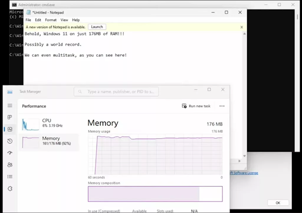 Windows 11推出后,对硬件配置提出了更高的要求。不过,这难不倒开发者们。日前,Windows 11第三方超精简版本Tiny11作者NTDev完成新壮举,在仅仅176MB内存的环境中把Windows 11跑起来了,这个RAM容量大约是微软官方要求的1/20。