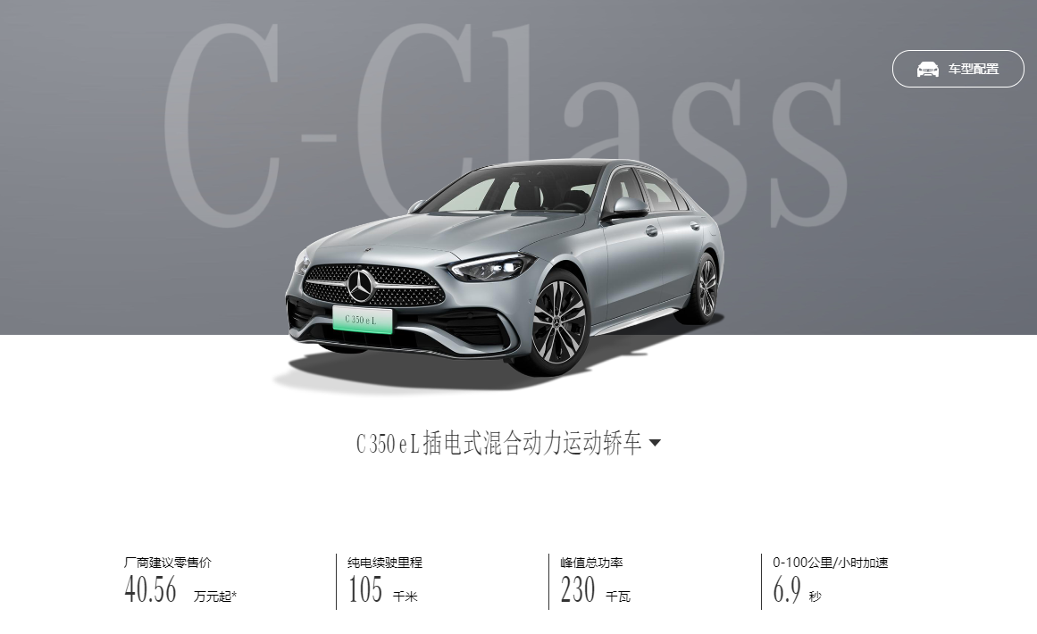 此次发布的新车与C级其他车型最大的区别就是其搭载了由2.0T发动机和电机组成的插电式混合动力系统,系统综合功率为230千瓦,零百公里加速时间6.9秒,WLTC工况下纯电续航里程105公里。