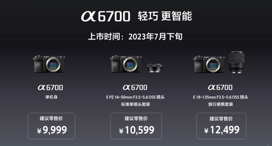 今晚索尼正式发布A6700旗舰APS-C微单相机,采用最新2600万像素传感器,售价9999元起,将于7月下旬上市。索尼A6700单机身售价9999元,标准单镜头套装(E PZ 16-50 F3.5-5.6 OSS镜头)售价10599元,旅行便携套装(E18-135mm F3.5-5.6 OSS镜头)售价12499元。
