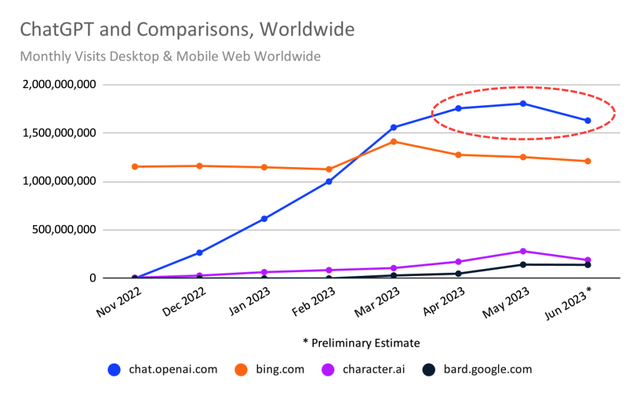 根据Similarweb的数据,ChatGPT的网站流量从5月到6月下降了9.7%,这是这个革命性的人工智能门户自去年11月受到人们广泛关注以来首次出现月度流量下降。