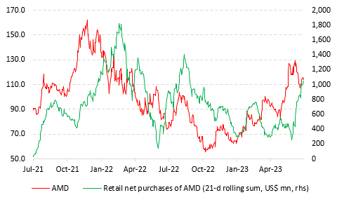 人工智能概念股的需求本身也在放缓,例如散户对并非是AI概念股的芯片股AMD的需求在增加,而非英伟达。Vanda认为: