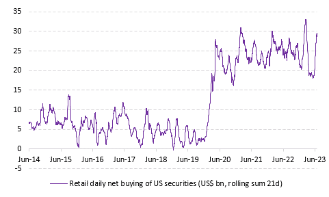 散户们似乎也已经意识到人工智能热潮存在的问题。正如专注策略和宏观研究的Vanda Research最新发布的周度报告所写,散户投资者继续积极追逐更广泛的美股上涨,也通过股票 ETF 进行投资——这表明他们不仅看好特定主题,而且看好整体美国股市。与此同时:
