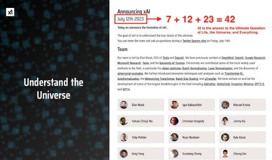 特斯拉CEO埃隆·马斯克周三正式成立了人工智能公司xAI,旨在挑战OpenAI的主导地位,并“了解宇宙的真实本质”。马斯克在一条推文中披露了xAI成立日期中隐含的深意,他分享了一张xAI官网介绍页面的截图,将公司成立日期“2023年7月12日”标红,并在旁边加上一行文字:“7+12+23=42。42是生命、宇宙和万物终极问题的答案。”