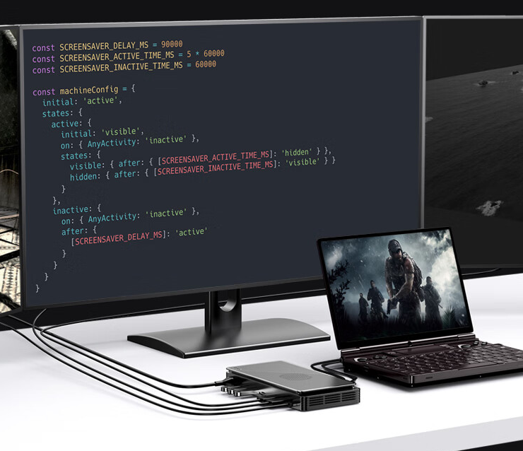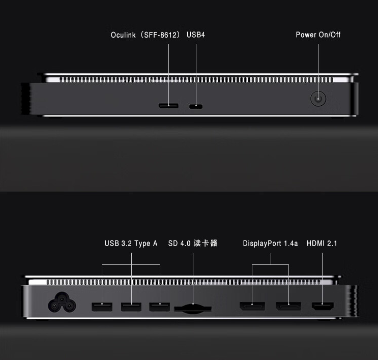 USB4、Oculink两个接口同时使用,各自走独立的PCIe通道,可以发挥最大性能,其中Oculink负责显卡和三个视频接口输出,USB4负责USB-A、SD卡等数据传输。