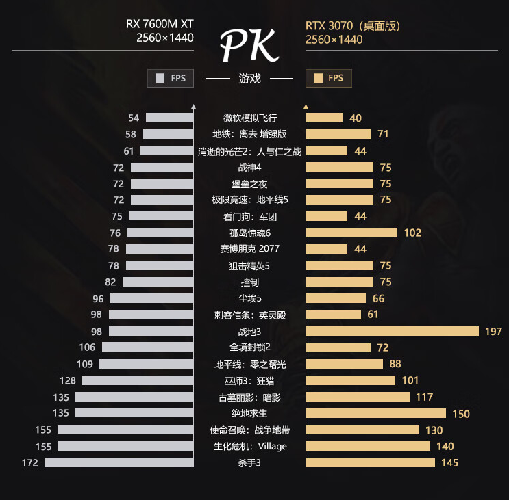 RX 7600M XT显卡基于6nm工艺、RDNA3架构,4096个流处理器,32个光追核心,128个纹理单元,64个光栅单元,核心频率基础1500MHz、游戏2300MHz、加速2615MHz,搭配128-bit 8GB GDDR6显存,等效频率18GHz,整卡最大功耗120W,主动风扇散热。