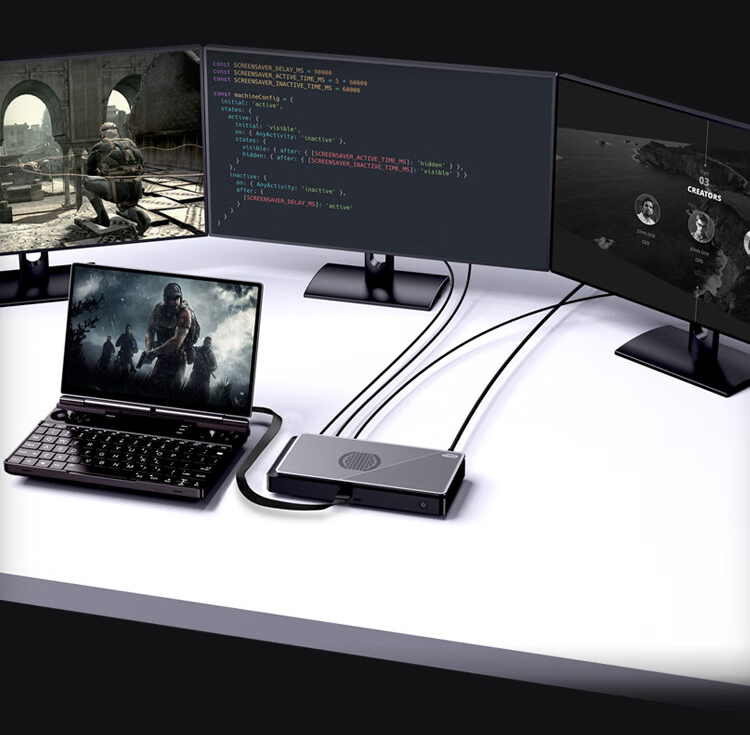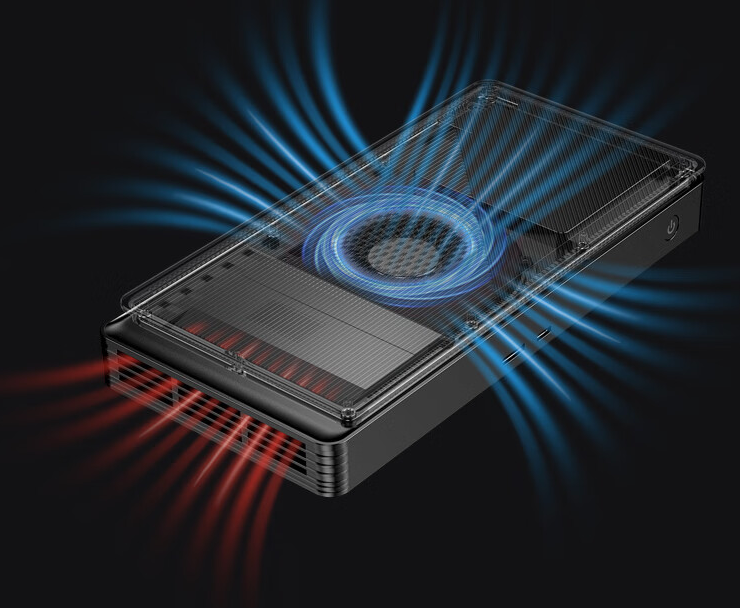 对外连接方面,标配USB4接口,可连接任意USB4、雷电3、雷电4设备,包括三屏输出,同时可选GPD独有的Oculin接口,走的是PCIe 4.0 x4,有效带宽约63Gbps,搭配HDMI、DP接口也可以三联屏。