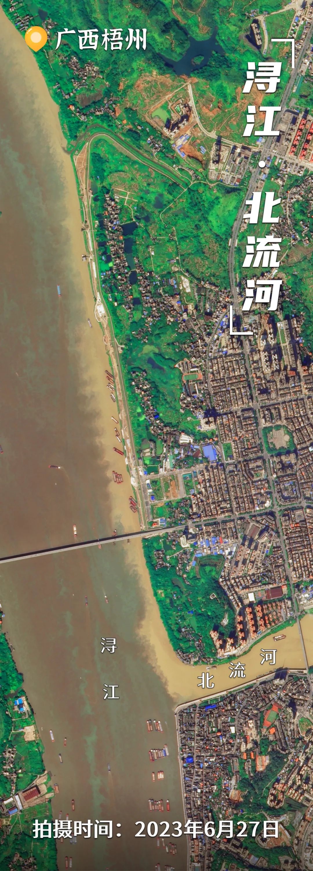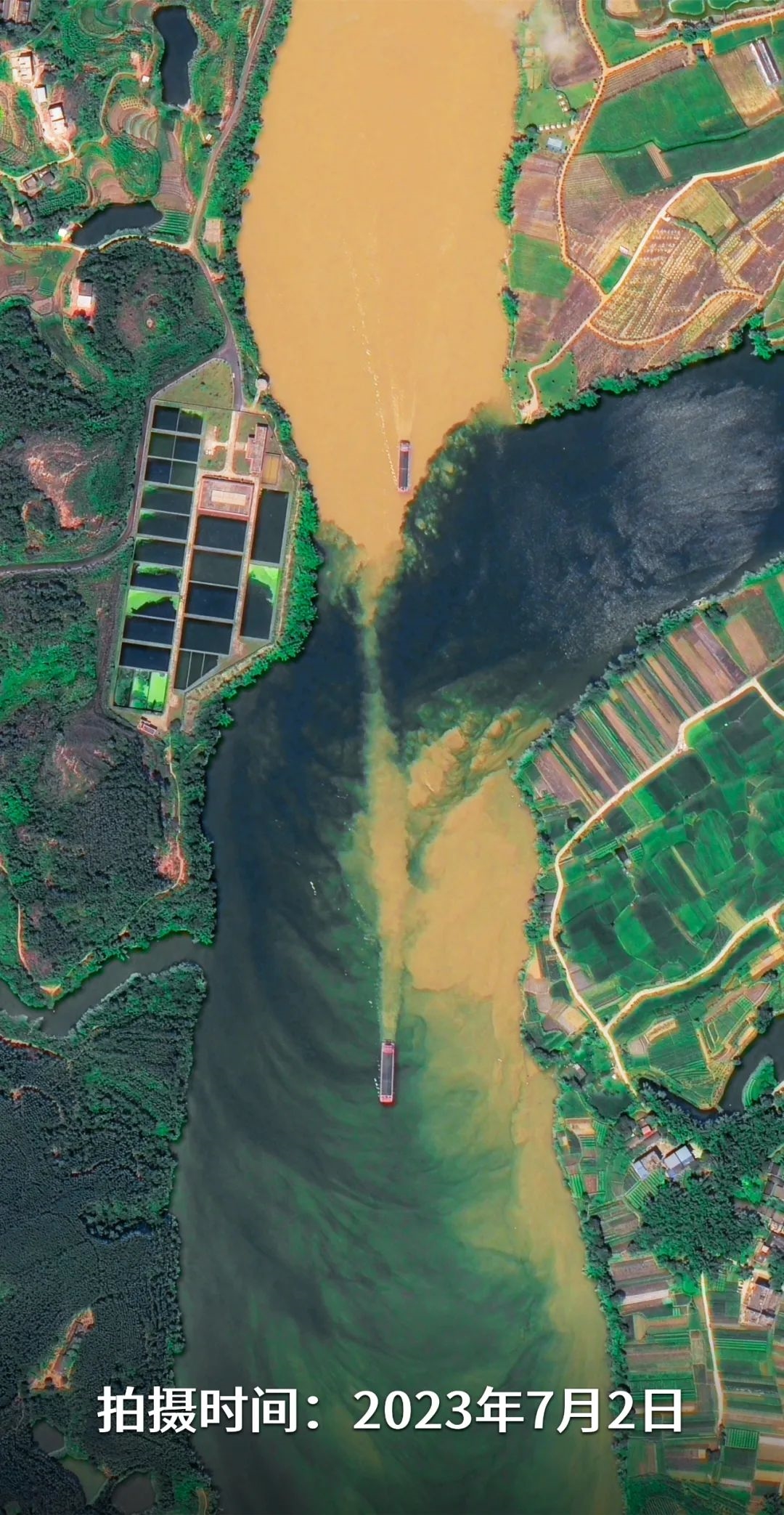 再看广西梧州藤县,作为“西南水上门户”,是一个百河汇流之地,珠江的干流浔江和两条一级支流北流河、濛江河在藤县中部交汇,其中北流河汇入浔江时相对浑浊,因此呈现清晰的分界。