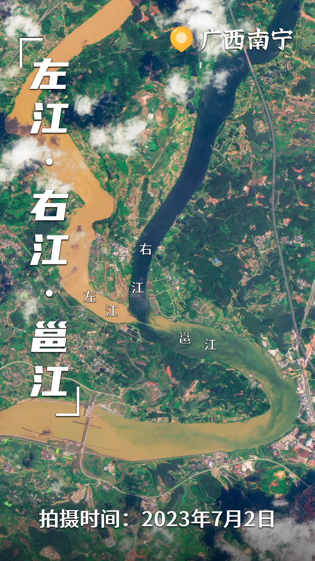 广西南宁江西镇的三江口又是不同的美,左江呈现黄色,右江呈现青色,两江在三江口汇成南宁的母亲河邕江。