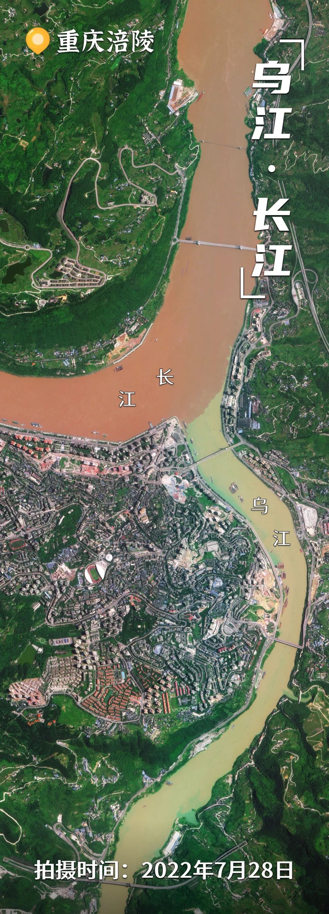 重庆涪陵区,乌江、长江交汇处,澄黄的长江和碧绿的乌江界限分明,多在夏季汛期时出现,原因是长江上游强降雨影响,流入长江的泥沙含量增加,呈现为“红汤”。