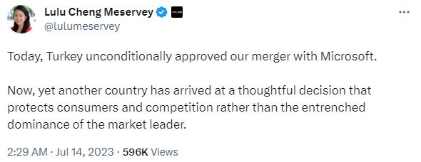 今日(7月14日),动视暴雪公司事务副总裁LuluChengMeservy发推宣布土耳其监管机构于7月13日批准了微软动视暴雪收购案,Lulu表示:“现在,又一个国家做出了一项深思熟虑的决定,保护消费者和竞争而不是去保护市场领导者根深蒂固的主导地位。”