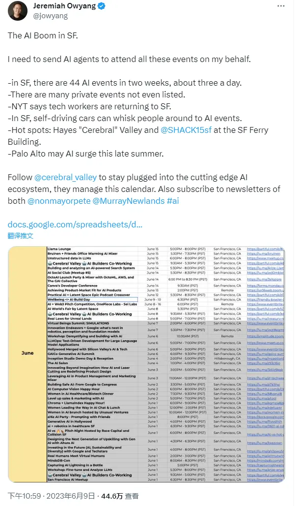 6月初,在中东创办AI网红博文生成器的Mike Grabowski在社交媒体上感叹称,在旧金山,短短两周就有44场与AI有关的活动,平均一天就有3场。而事实上这个频率一直延续到整个6月,而Grabowski自己主办的活动就收到了560个参会申请。