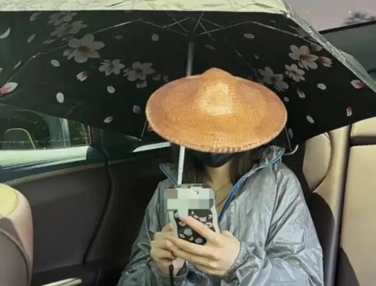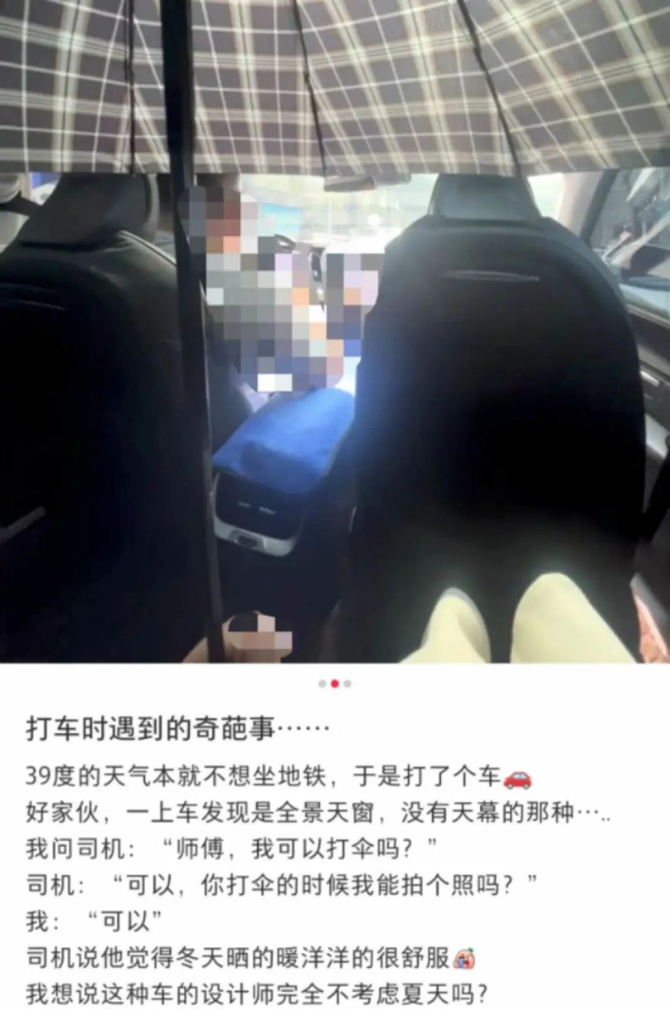 还有乘客分享打车经历,在前几天高温达到39度时,她不想挤地铁,就选择打车,打到了一辆纯电车,上车之后发现是全景天窗,还没有任何遮挡,为了不被太阳直晒,她默默地撑开了伞...