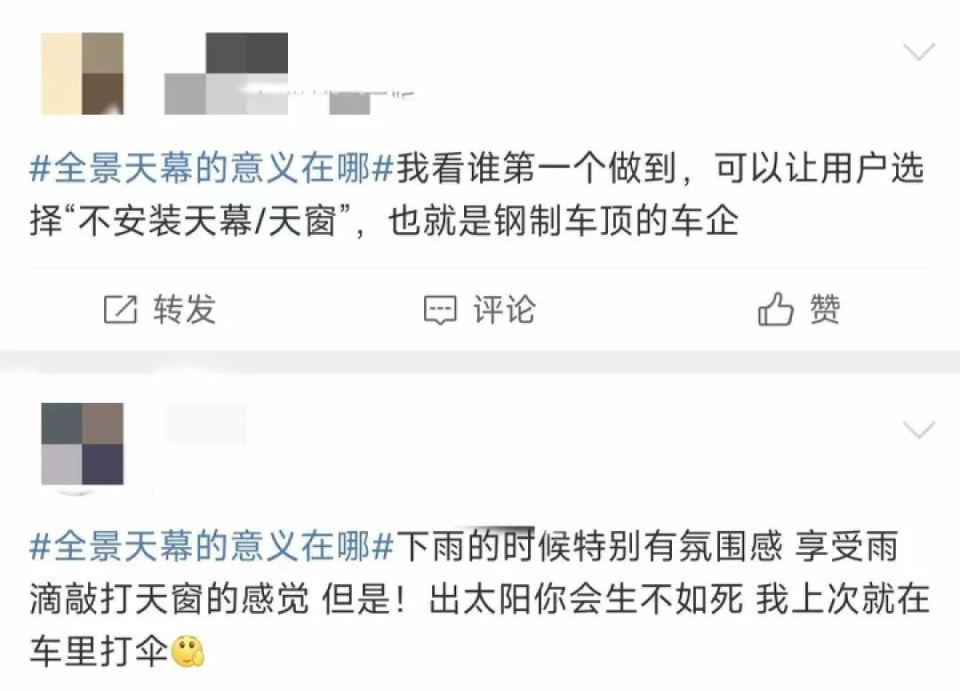 在微博上,还出现了一个#全景天窗的意义在哪#的讨论词条,有人表示,我看谁能第一个做到,让用户选择“不安装天幕/天窗”。