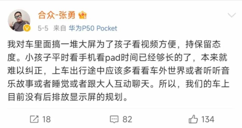 哪吒CEO张勇也对后排大屏表示拒绝,称不会在自家车后排安装显示屏。