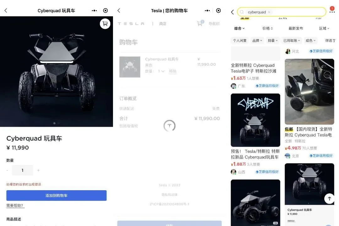 此次国内首次开售,不到一分钟,特斯拉中国官网已经被挤爆,天猫等平台现货全部售空。紧接着,闲鱼等二手平台开始出现“黄牛货”,原价11900元的Cyberquad玩具车,被打上“孩子的第一辆特斯拉”标签,加价后价格达到1.5—4.98万元。