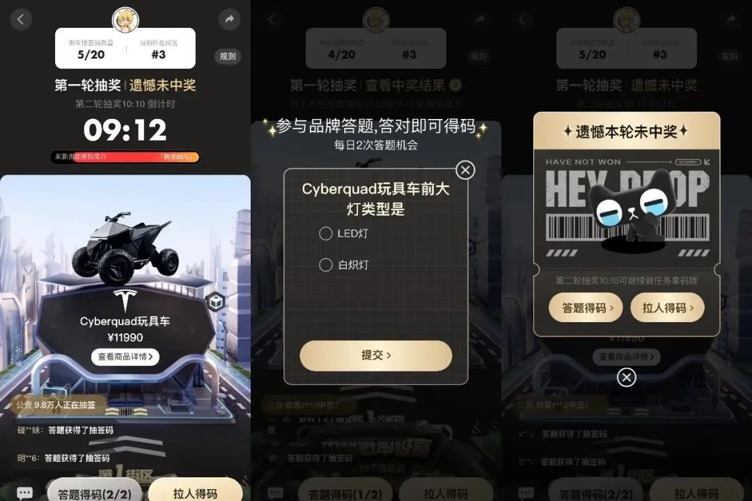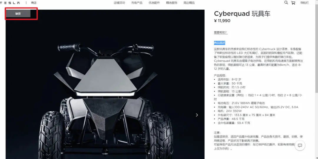 此次Cyberquad玩具车在国内上市,销售渠道包含特斯拉官网、官方微信小程序商店、天猫/京东旗舰店,其中天猫旗舰店在7月11日消息曝光后不久,就率先推出抽签预约。