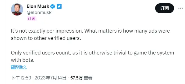 凭借社区里的分享截图,有自媒体总结称“10亿浏览量约等于1万美元”的结论。马斯克特地把这条推文拎出来强调称,这笔钱并不依据整体浏览量的数据,最重要的是向多少经过认证的用户展示广告。而且只有经过验证的用户才算数,这样能够避免“机器人玩弄系统”。