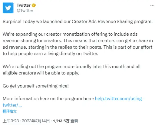 顺便一提,Twitter第一大网红马斯克已经宣布会把流量激励“让”给其他创作者们,所以对于“马斯克能赚多少广告分成”好奇不已的“吃瓜群众”们只能悻悻而归。