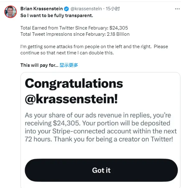 举例而言,拥有75万粉丝的Twitter自媒体博主Brian Krassenstein截图称自己收到接近2.4万美元的分成。他同时透露,从今年2月开始他的推文总共被浏览了21.8亿次。