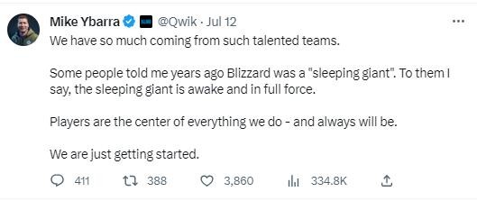 在美国法院否决了FTC对微软收购案提出的禁令后,暴雪总裁Mike Ybarra似乎对此次裁决结果非常满意,他发推赞扬了暴雪团队,表示暴雪这个“沉睡的巨人”已经苏醒,并会全力以赴。