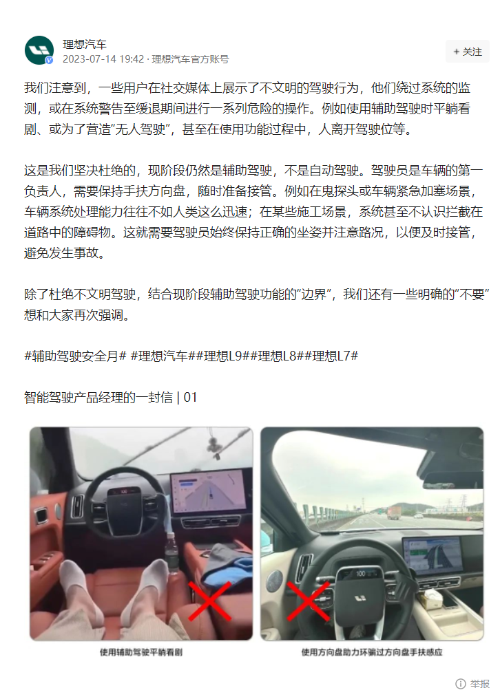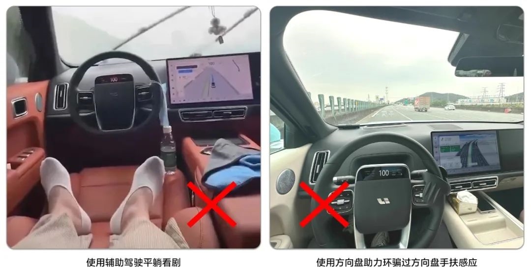 理想汽车举例称,比如使用辅助驾驶时平躺看剧、或为了营造“无人驾驶”,甚至在使用功能过程中,人离开驾驶位等。