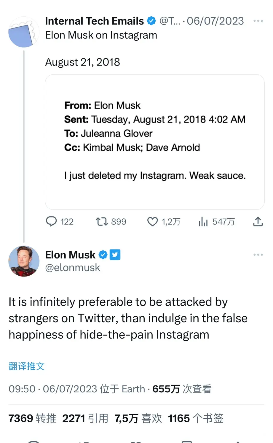 马斯克则利用这一点,在Twitter上对Threads冷嘲热讽:“在Twitter上被陌生人攻击,比沉溺于掩饰痛苦的Instagram的虚假快乐要好得多。”