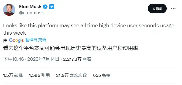 也是在14日,马斯克发推表示:“看起来,本平台可能会出现历史最高的秒使用量(Seconds usage)。”没过多久,马斯克贴出一张图并表示:平台使用周环比增长3.5%。