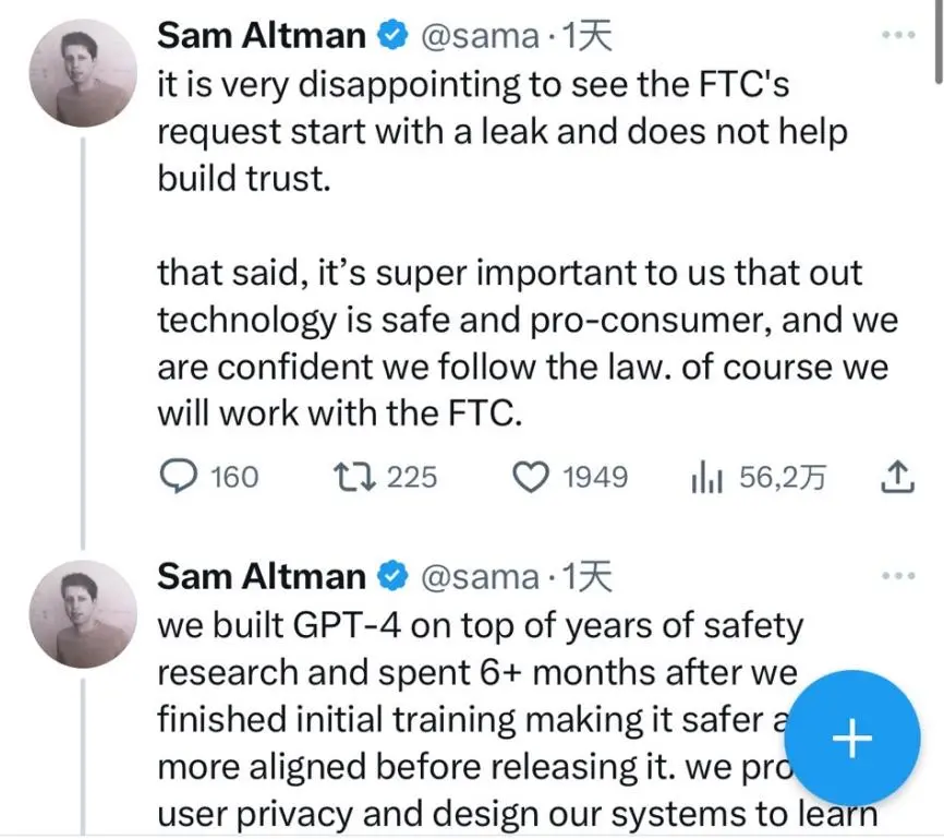 而Threads的信息流,基本上是Instagram的另一个版本:网红和品牌发布赏心悦目的照片,就连科技大佬贝索斯都发布着自己和猫咪的合照。阿尔特曼在Threads发了一条“很有趣”之后,还是选择在Twitter活跃,批评FTC针对OpenAI展开调查一事。
