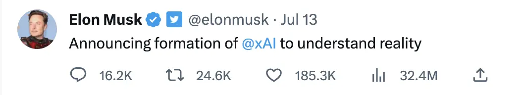 马斯克官宣xAI成立,并提到愿景是“理解真实”,xAI官网的slogan则为“理解宇宙”。图源:Twitter