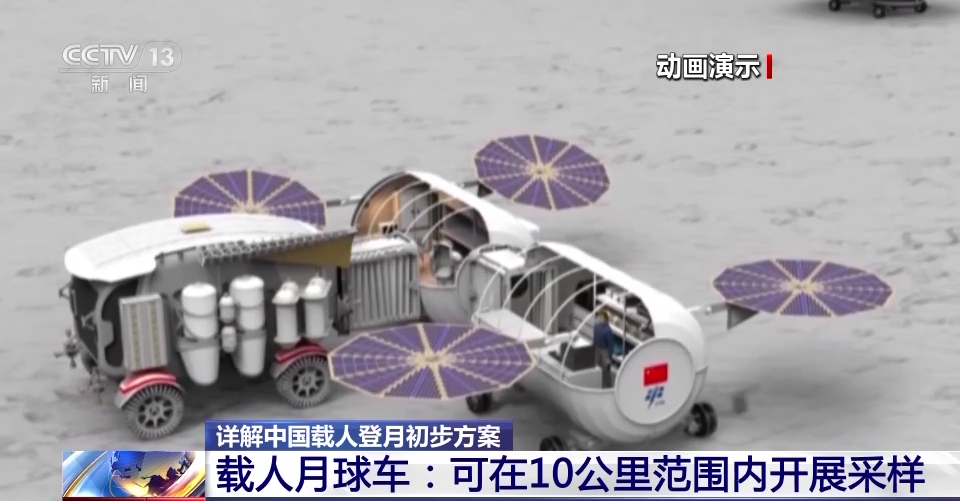 利用月面着陆器将两名航天员、月球车相关的载荷送达月球表面后,航天员将乘着月球车在10公里的范围之内开展月球采样,以及相应的月面实验。