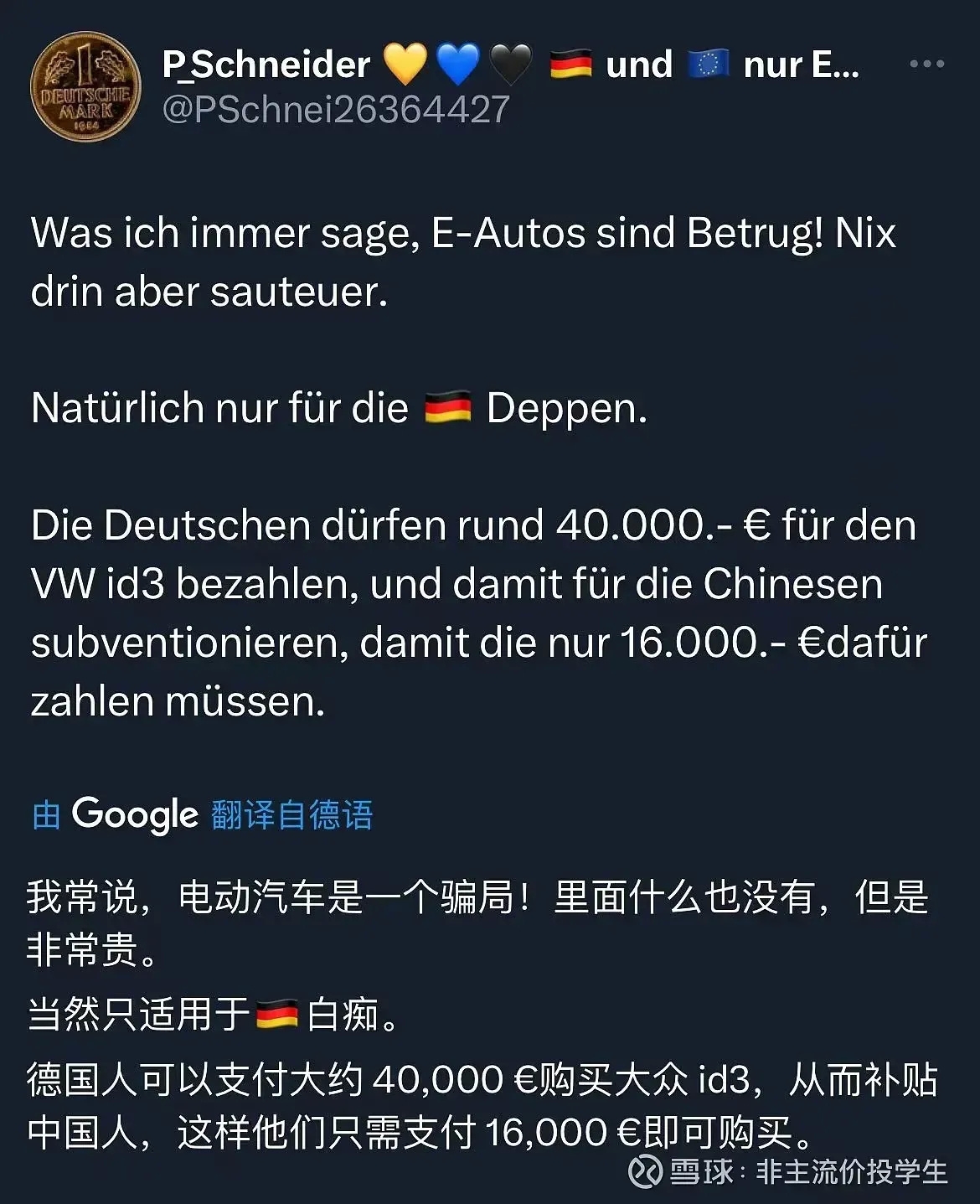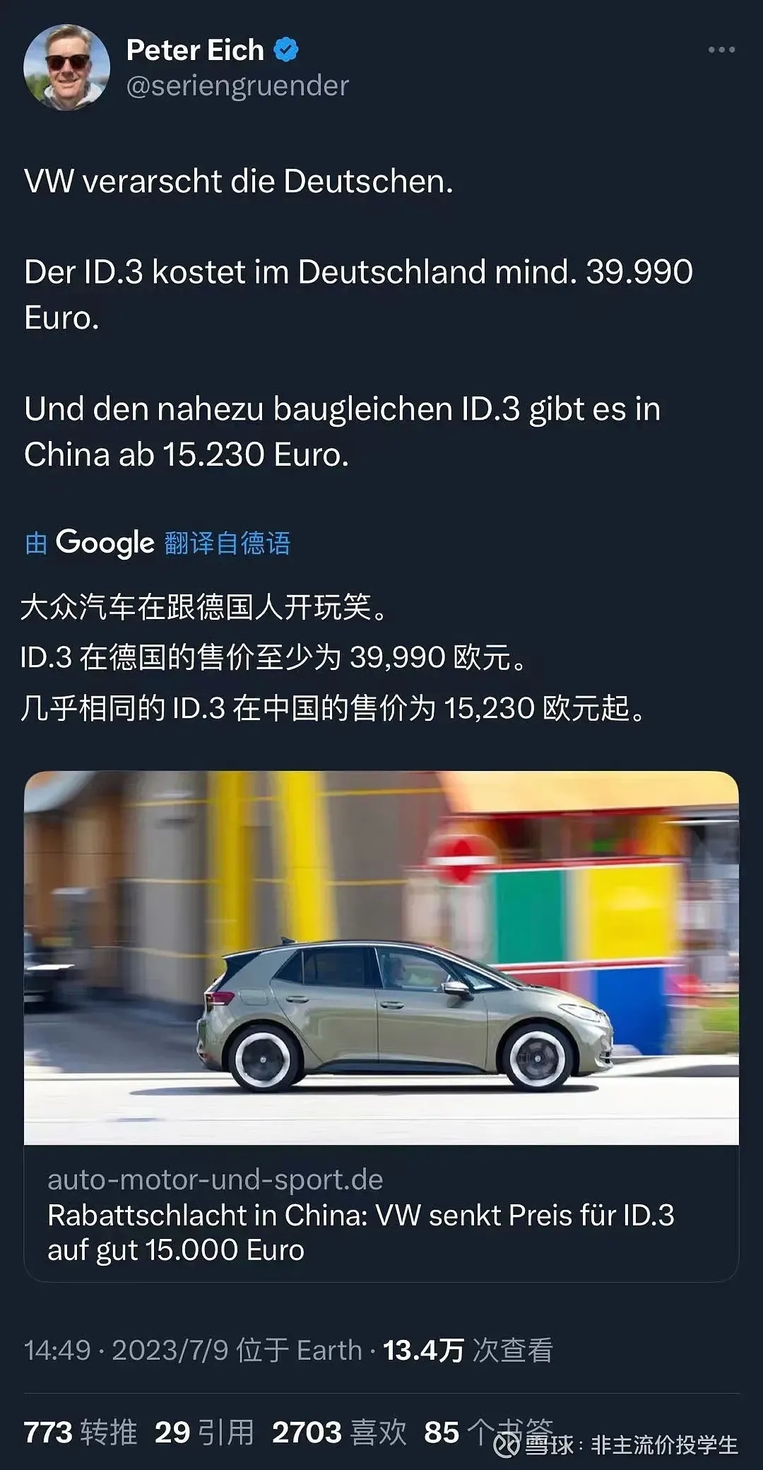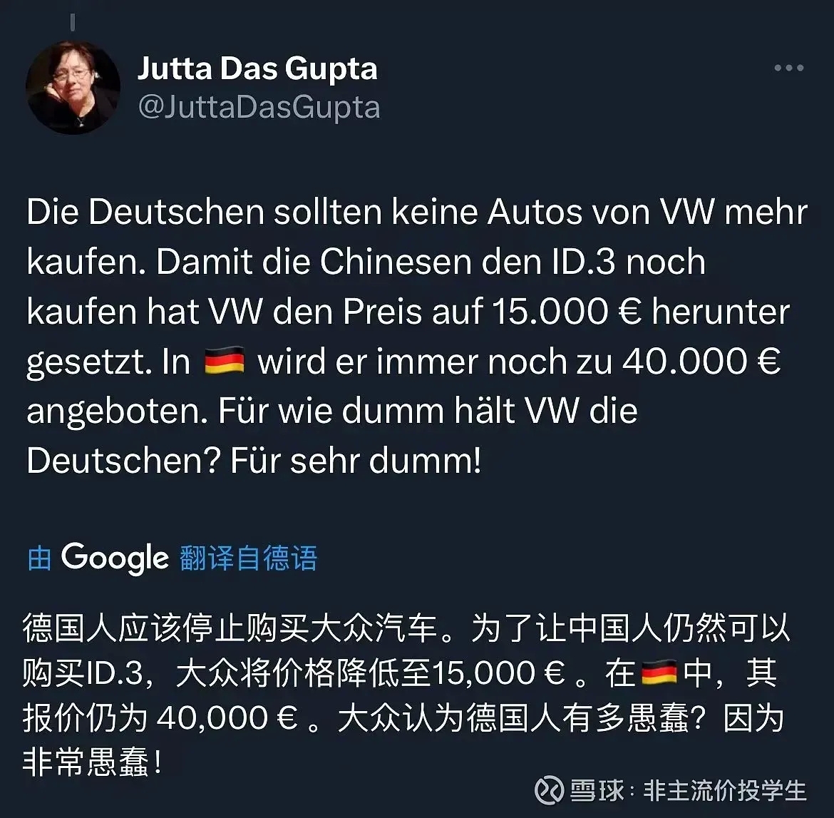 不少德国网友怒了,直言“大众汽车在跟德国人开玩笑”、“电动车就是个骗局,什么也没有还非常规,只适用于德国白痴”、“德国人拿4万欧元购买ID.3,来补贴中国人,他们只需要1.6万欧元就能买到”、“德国人应该停止购买大众汽车”