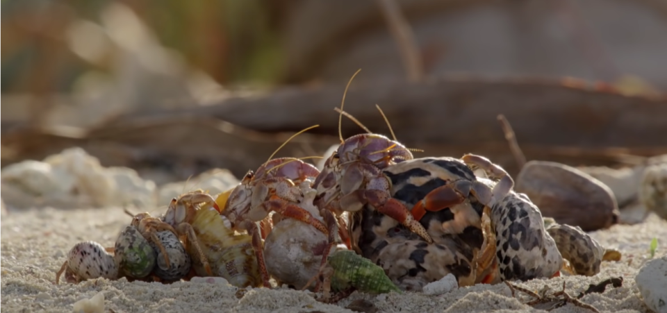 更为壮观的是,为了寻找一个适合自己的螺壳,寄居蟹还参加类似跳蚤市场的活动。会按大小排成一队,依次交换外壳,有秩序也很和谐。