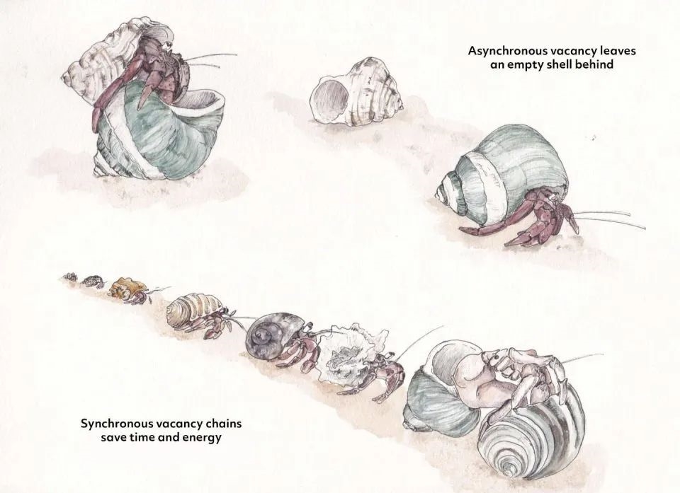 直到足够大的螃蟹出现并认领了大空壳后,那么它换下来的旧壳就会被下面排队的寄居蟹认领,以此类推,整个队伍中的寄居蟹都能按照次序完成换壳。