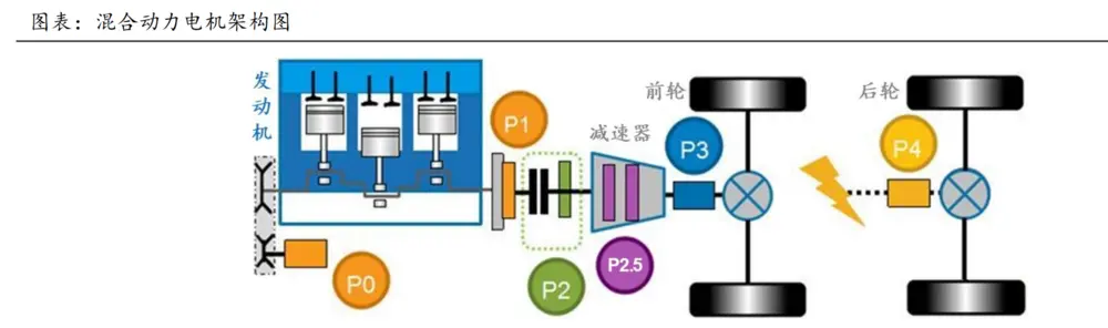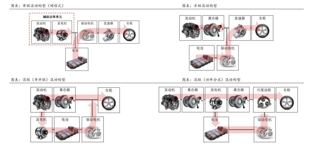 一台插混车上,可以在多个位置配载电机,根据动力构型不同,分为串联式、并联式和混联式三种。