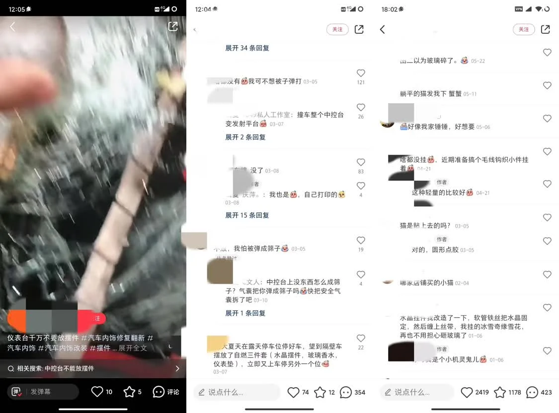相关搜索内容也不乏“劝退”的帖子,明白人还是有不少的,他们也深知在车内放摆件的危害性。不过我发现一个比较奇怪的情况,一般推荐汽车摆件的帖子,评论区绝大多数人只会问怎么买、好不好用,从来没有好心人提醒,这种前所未有的“井水不犯河水”的和谐场面竟让我有点吃惊。