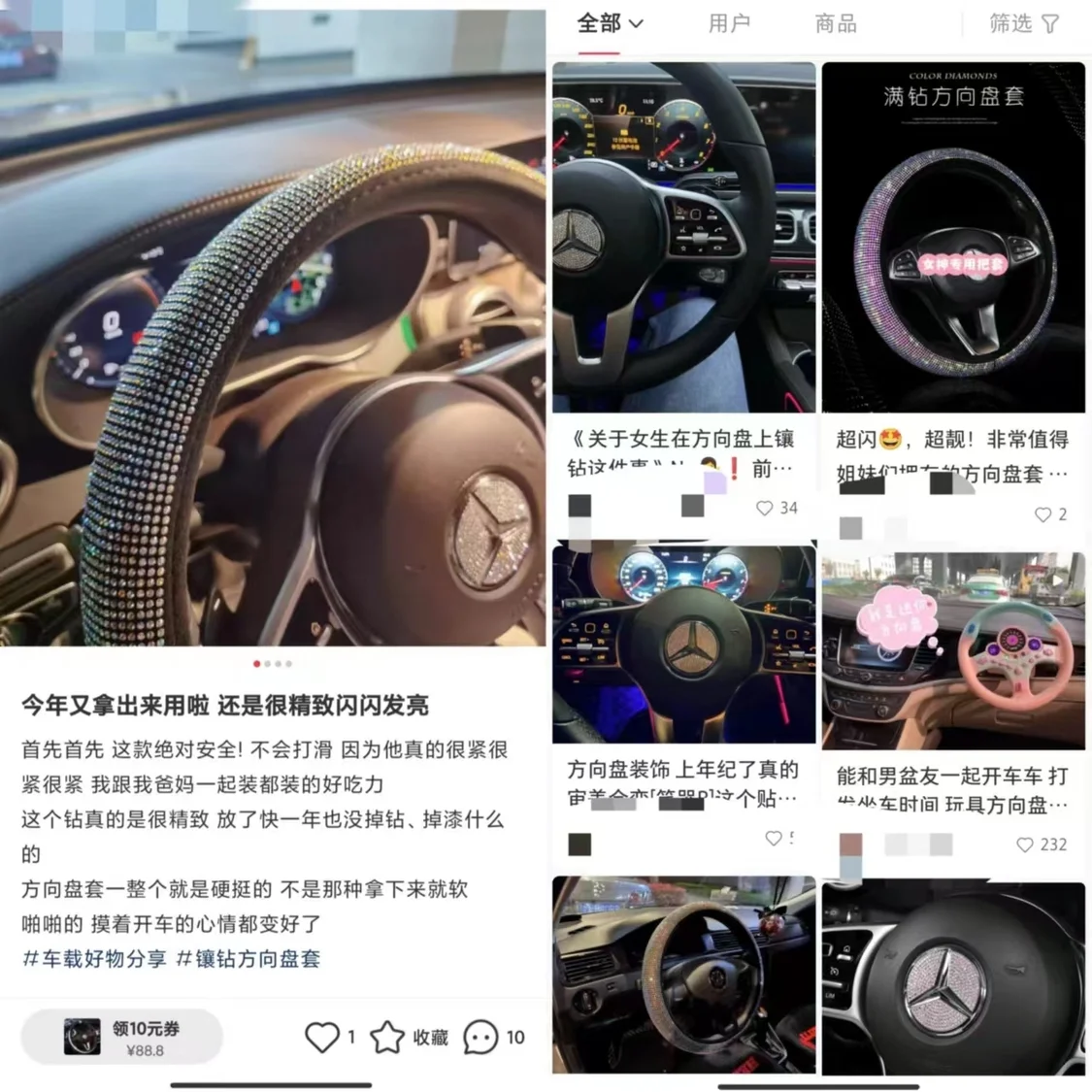 在后视镜上挂点小挂件,小通觉得没什么问题,但在方向盘上加各种彩钻,一时间竟不知道是出于哪个层面的考虑,主打的就是一个看不懂。我在某社交平台上,经常能够看到各种分享车内“精装修”的帖子,花里胡哨是装点得很精致了,甚至还动员家人一起,往车上贴钻石、放各种摆件......这得有多少个“破片手雷”放你面前。
