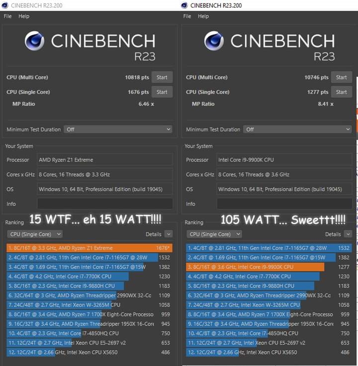 虽然功耗大降,但锐龙Z1系列处理器的性能可不弱,网友Mochamad Farido Fanani公布了锐龙Z1 Extreme的Cinebench R23的单核及多核跑分,WCCFTehc制作了一张表格对比。