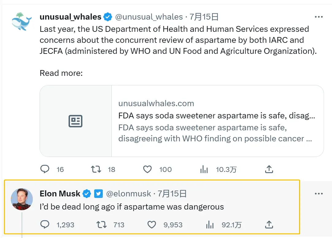 然而马斯克却不以为然,日前,他回应了一条有关美国FDA坚持认为阿斯巴甜安全的推文,并评论称:“如果阿斯巴甜有危险,我早就死了。”