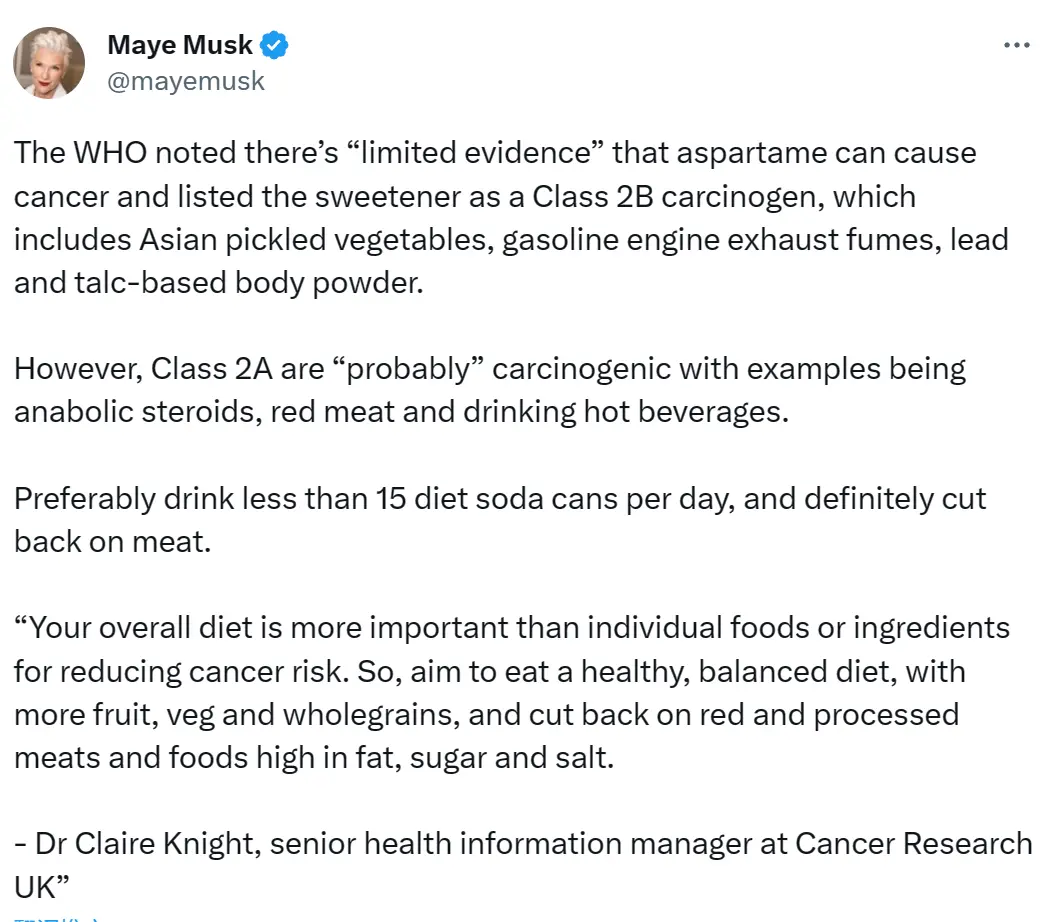 马斯克的妈妈梅耶尔·马斯克周日也发帖表达了自己的看法,称“最好每天喝少于15罐无糖汽水,并且一定要减少吃肉。”马斯克回复了母亲的推文,称“的确如此。