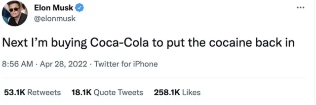 当地时间2022年4月28日,马斯克发布Twitter,称“Next I’m buying Coca-Cola to put the cocaine back in(接下来我要收购可口可乐,并把可卡因放回去)”。言论一出,全球震惊,此推文仅仅用了几个小时,就收获了超过10万条评论,以及百万个赞。