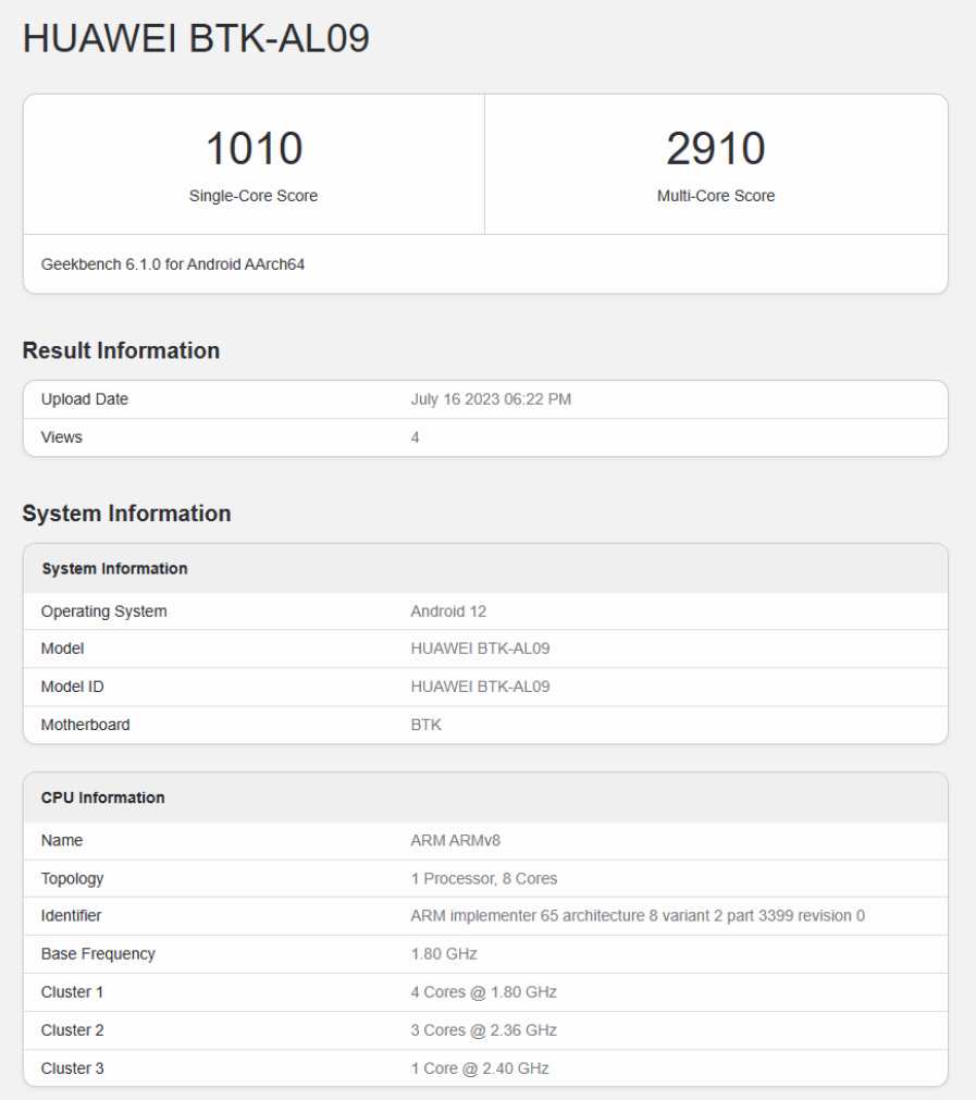 此前华为在官方商城上架了新品预热界面,显示新款MatePad 2023将在7月20日推出。该设备的跑分信息已经在Geekbench数据库中被找到,是一款4G网络版本,搭载了高通骁龙7 Gen1芯片,配备6GB内存。