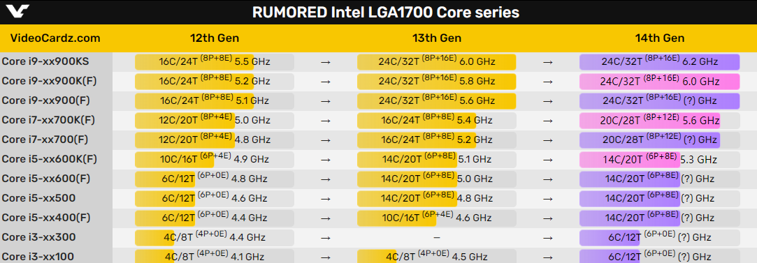 根据之前曝料,14代i7系列全部8+8核心变成8+12核心,i5系列有8+8、6+8核心两种组合,i3系列则是全部6个大核心。
