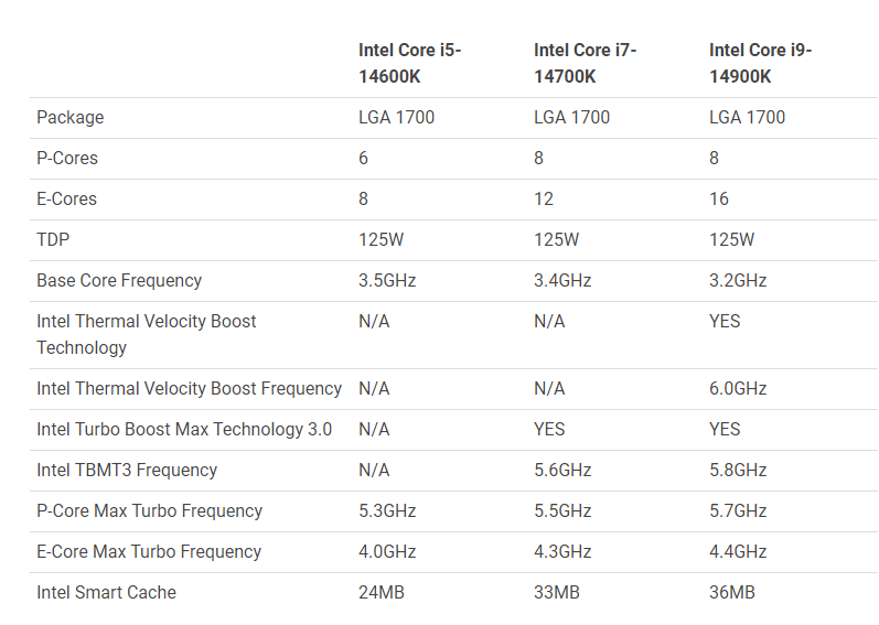 代号Meteor Lake的酷睿Ultra系列实力不足,只能用于主流和轻薄笔记本上,桌面平台上只能把13代酷睿再升级一把扛一扛,这就有了Raptor Lake Refresh 14代酷睿。14代酷睿首发的型号,按照惯例还是K/KF系列,包括i9-14900K/KF、i7-14700K/KF、i5-14600K/KF,普遍大核加速200MHz、小核加速100MHz。