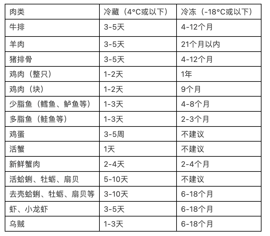 下面是美国Foodsafety网站以及美国农业部推荐的一些生肉保存时间:
