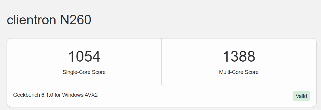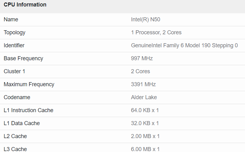 现在,N50第一次露面,出现于GeekBench数据库,可以看到只有2核心2线程,这也是Intel当今唯一的双核处理器。