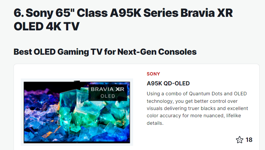 6、索尼65英寸A95K系列Bravia XR OLED 4K电视——适用于下一代游戏机的最佳 OLED 游戏电视