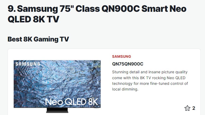 9、三星75英寸QN900C智能Neo QLED 8K电视——最佳8K游戏电视